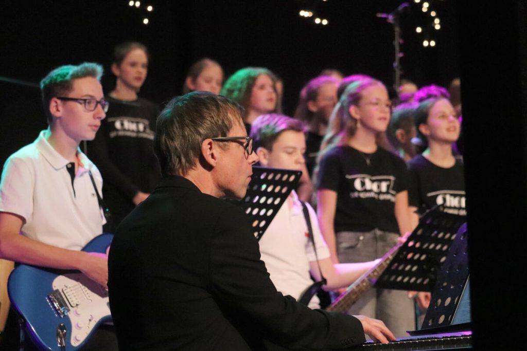 Andreas Worm ließ zunächst seinen etwa 100 Kinder starken „Chor I“ aus Schülern der Klassen 5 bis 7 auftreten. Auch hier fand sich ein dramatischer Aufbau, diesmal bezogen auf das Thema „Liebe“: Während der Song „Carry you home“ ein romantisches Bekenntnis zu Treue und Geborgenheit enthält, beschreibt Ed Sheerans „Shivers“ die elektrisierende Wirkung einer Leidenschaft.