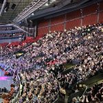 Der Montag stand dann erstmals unter dem Vorzeichen der ganz großen Kulissen: Nach den Proben mit mehreren hundert Mitmusizierenden aus aller Welt und einem Mittags-Dessert in Form einer Riesenkanelbulle (Zimtschnecke) ging es für die Eschweger Reisegruppe erstmals ins Scandinavium – eigentlich eine Eishockey-Arena, die aber auch schon einmal den Eurovision Song Contest beherbergte. Hier wurde das erste Mal in der späteren Location für das Abschlusskonzert geprobt. Damit auch die Göteborger Stadtöffentlichkeit mitbekommt, was die ganzen Jugendlichen in violetten T-Shirts eigentlich die ganze Woche über machen, gab es am Nachmittag zudem ein Pop-Up-Konzert auf dem zentralen Götaplatz.