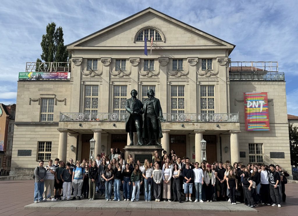 Am vergangenen Dienstag brachen die Jahrgänge Q1 und Q3 unseres Oberstufengymnasiums morgens um 8 Uhr mit drei Bussen in Richtung Weimar auf. Begleitet von fünf Lehrkräften, deren Unterrichtsschwerpunkt meist im Fach Deutsch liegt, erwartete uns ein abwechslungsreicher und inhaltlich eng an den Unterricht angebundener Tag.